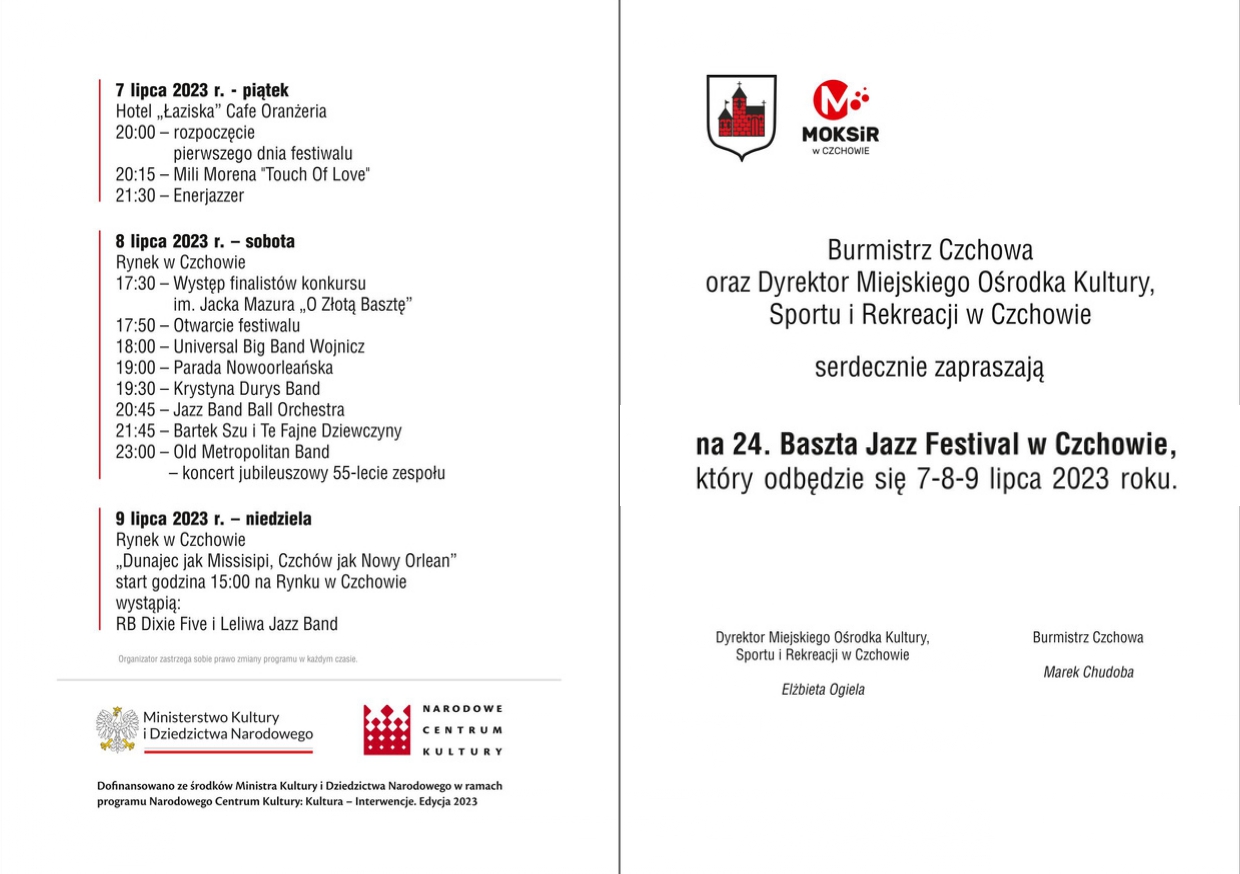 24. Baszta Jazz Festival odbędzie się 7, 8 i 9 lipca 2023 roku w Czchowie. Zrealizowane zostaną koncerty jazzowe, plenerowa wystawa fotograficzna, parada nowoorleańska, konkurs dla młodych instrumentalistów i wokalistów jazzowych, projekt ''Dunajec jak Missisipi, Czchów jak Nowy Orlean''. Koncerty odbędą się nad Jeziorem Czchowskim, na rynku i zamku w Czchowie. W tym roku wystąpi 9 zespołów, w tym: Jazz Band Ball Orchestra, Mili Morena, Krystyna Durys, Enerjazzer, Old Metropolitan Band oraz rodzime zespoły takie jak RB Dixie Five, Leliwa Jazz Band, Bartek Szu & Te Fajne Dziewczyny, Big Band Wojnicz.