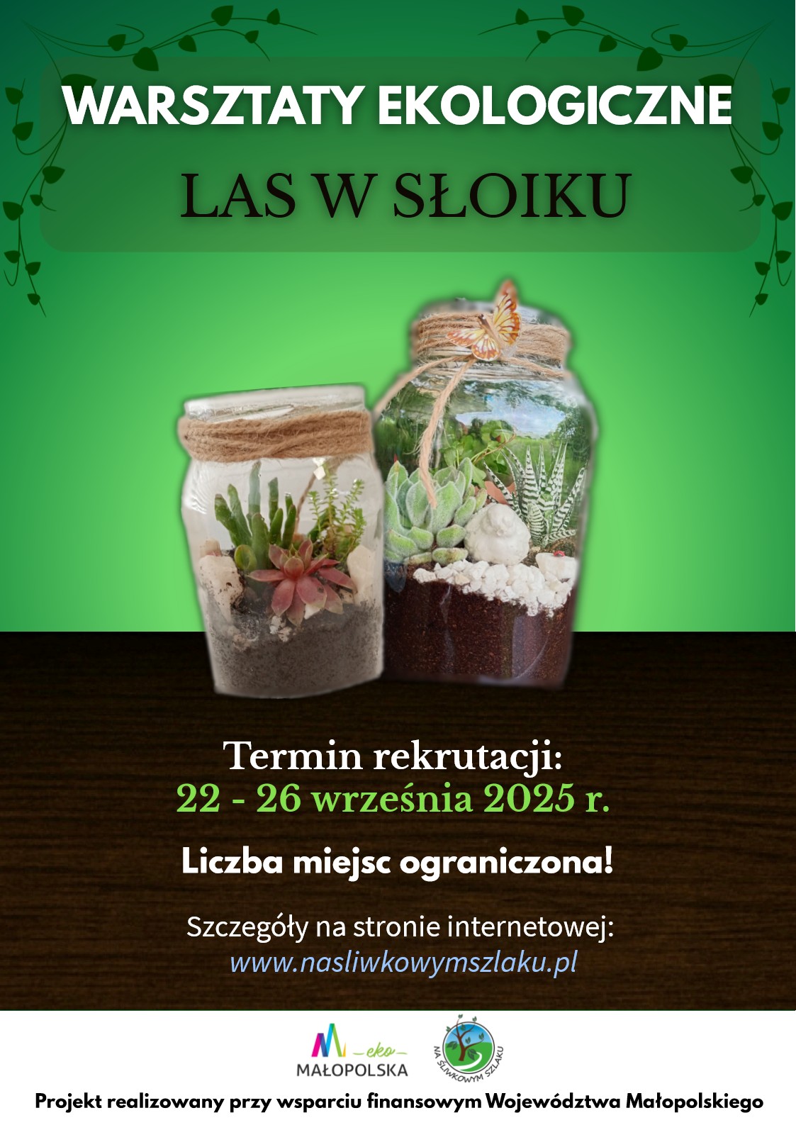 Stowarzyszenie ''Na Śliwkowym Szlaku'' ogłasza rekrutację uczestników do projektu pn. Warsztaty ekologiczne ''Las w słoiku''. W ramach projektu zaplanowano organizację 14 warsztatów ekologicznych na terenie Śliwkowego Szlaku.