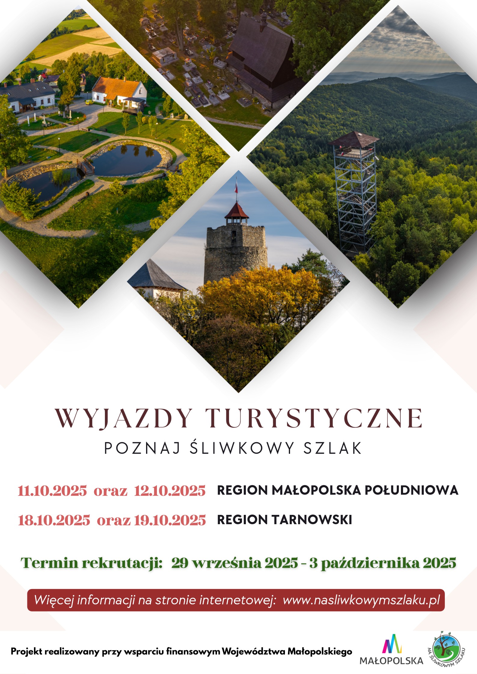 Stowarzyszenie ''Na Śliwkowym Szlaku'' ogłasza rekrutację uczestników wyjazdu turystycznego ''Poznaj Śliwkowy Szlak'', realizowanego w ramach projektu pn. ''Ciekawie na Śliwkowym Szlaku'', który odbędzie się w następujących terminach