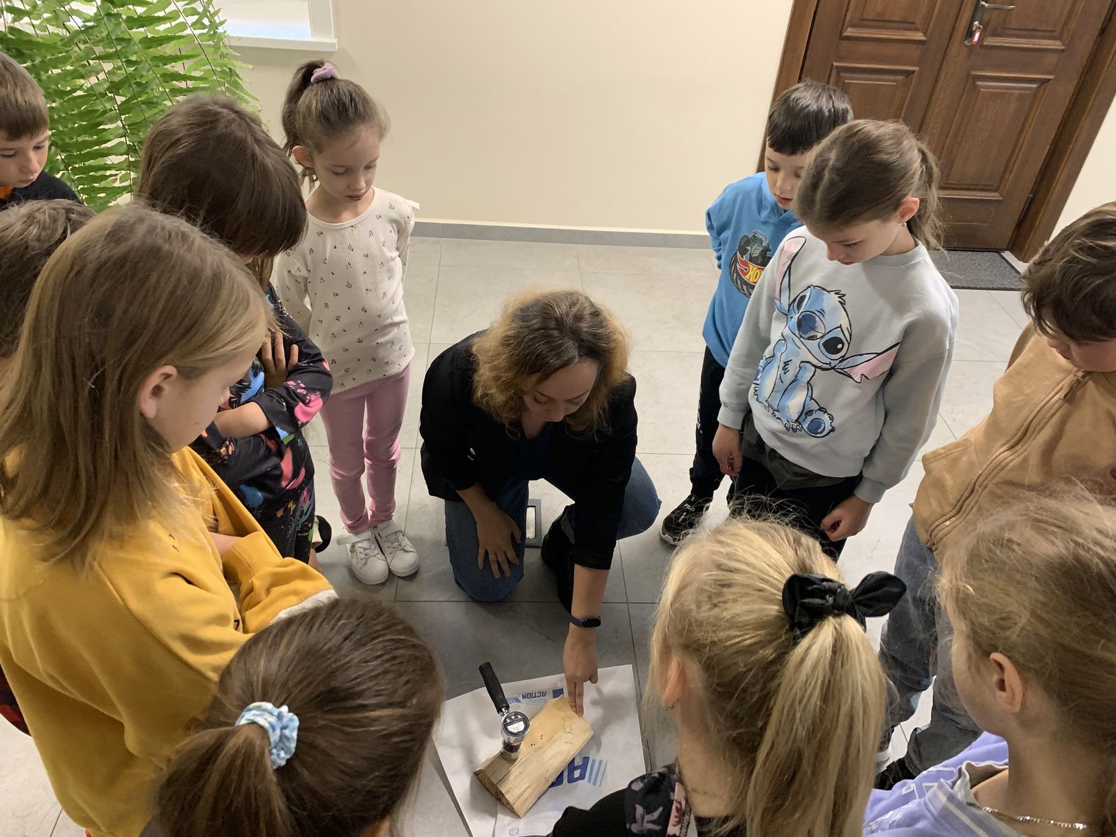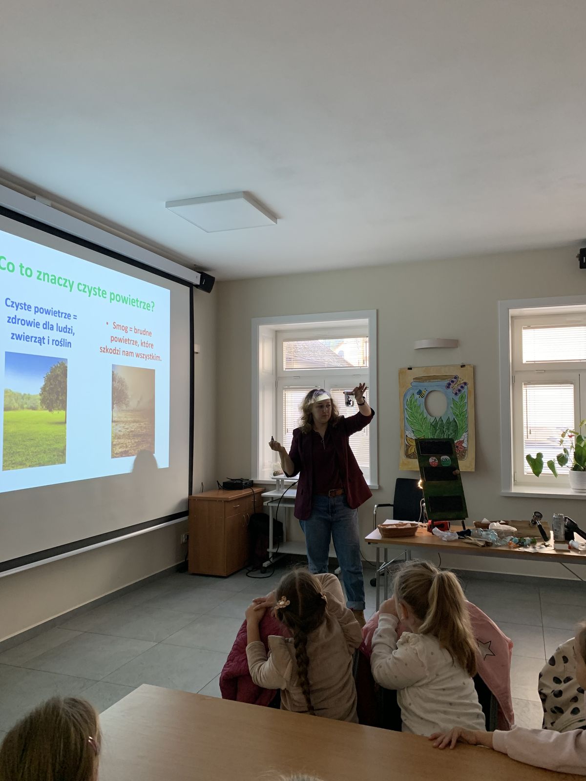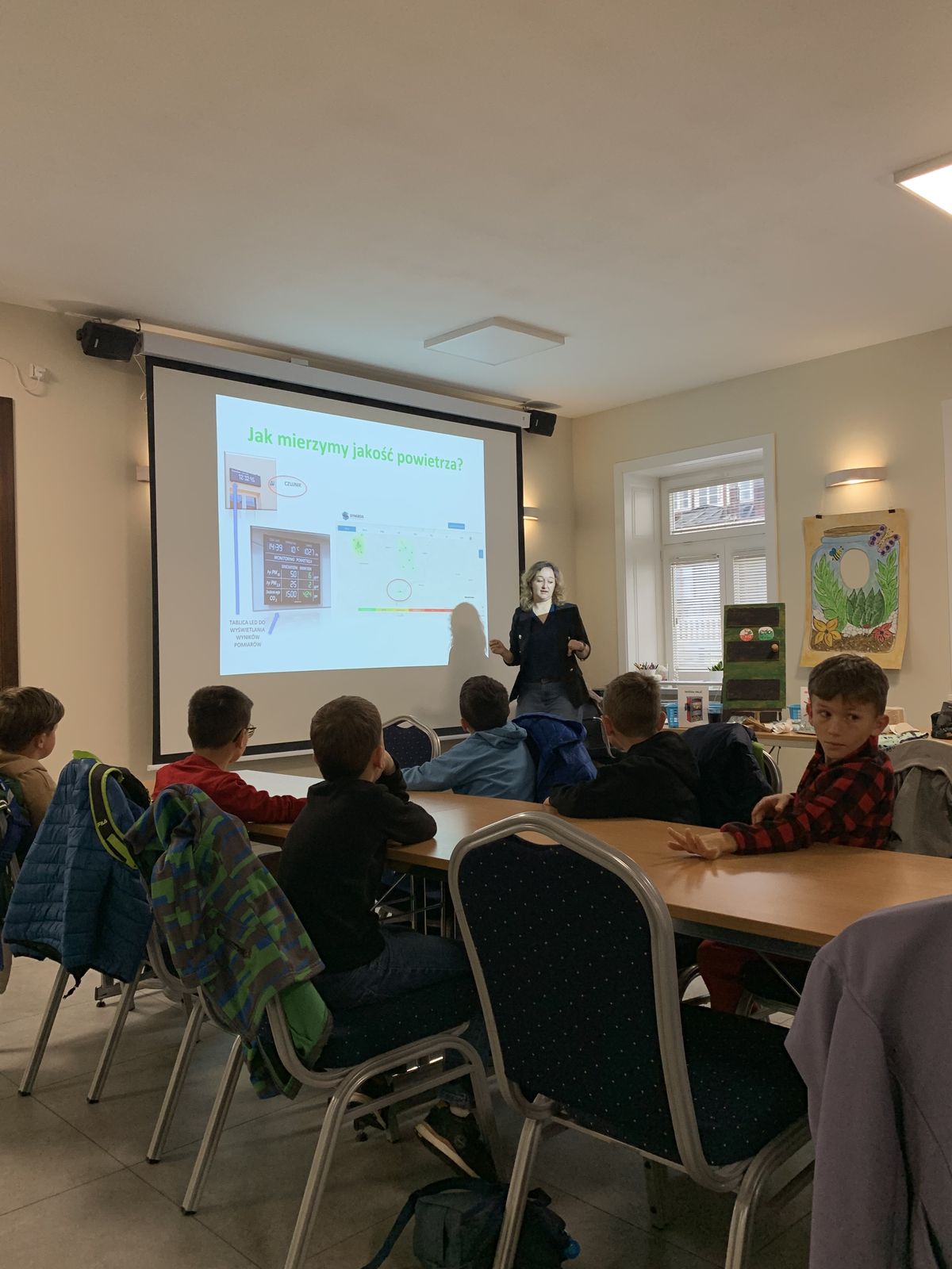 Podczas części teoretycznej uczestnicy rozmawiali o znaczeniu powietrza dla życia ludzi i zwierząt, o metodach pomiaru jakości powietrza oraz o roli roślin - naszych ''zielonych pomocników'' - w procesie oczyszczania powietrza. Dzieci zastanawiały się również nad tym, w jaki sposób zanieczyszczenia wpływają na zdrowie, środowisko i gospodarkę oraz jakie korzyści ekologiczne płyną z tworzenia mini-ekosystemów w słoiku. Ponadto, uczniowie dowiedzieli się, jak używamy kamery termowizyjnej i jak sprawdzamy wilgotność drewna za pomocą wilgotnościomierza. Na koniec części teoretycznej dzieci miały możliwość zrobienia sobie pamiątkowego zdjęcia ''w słoiku''.