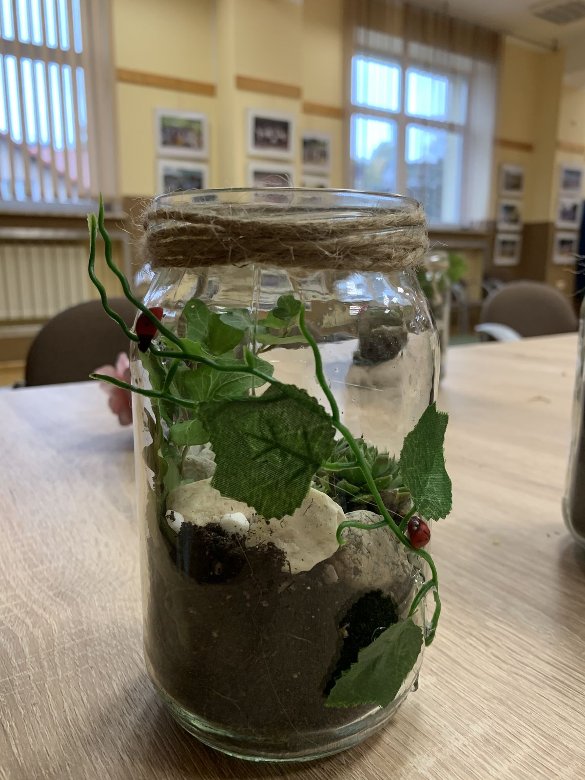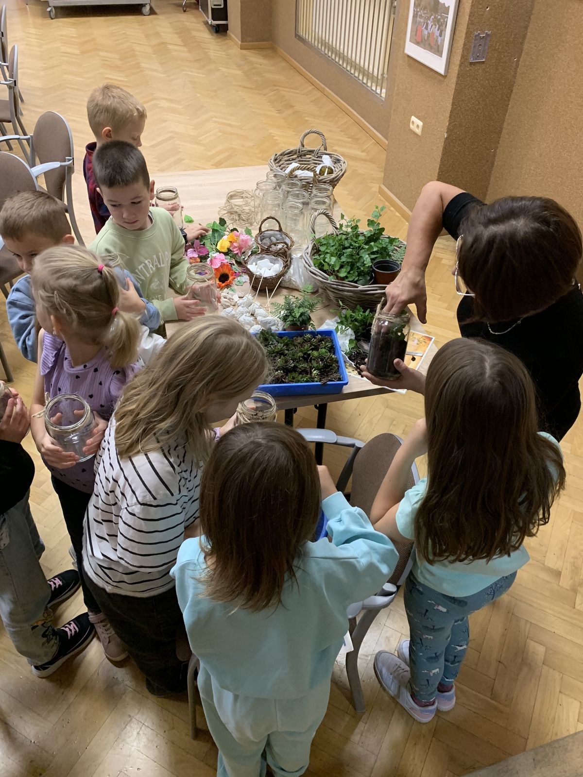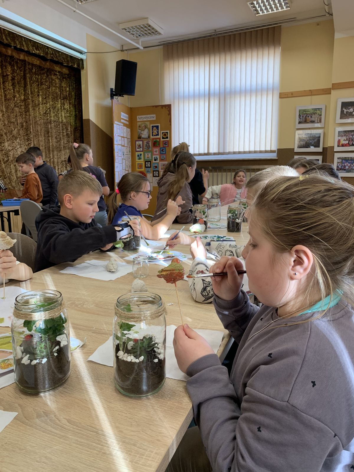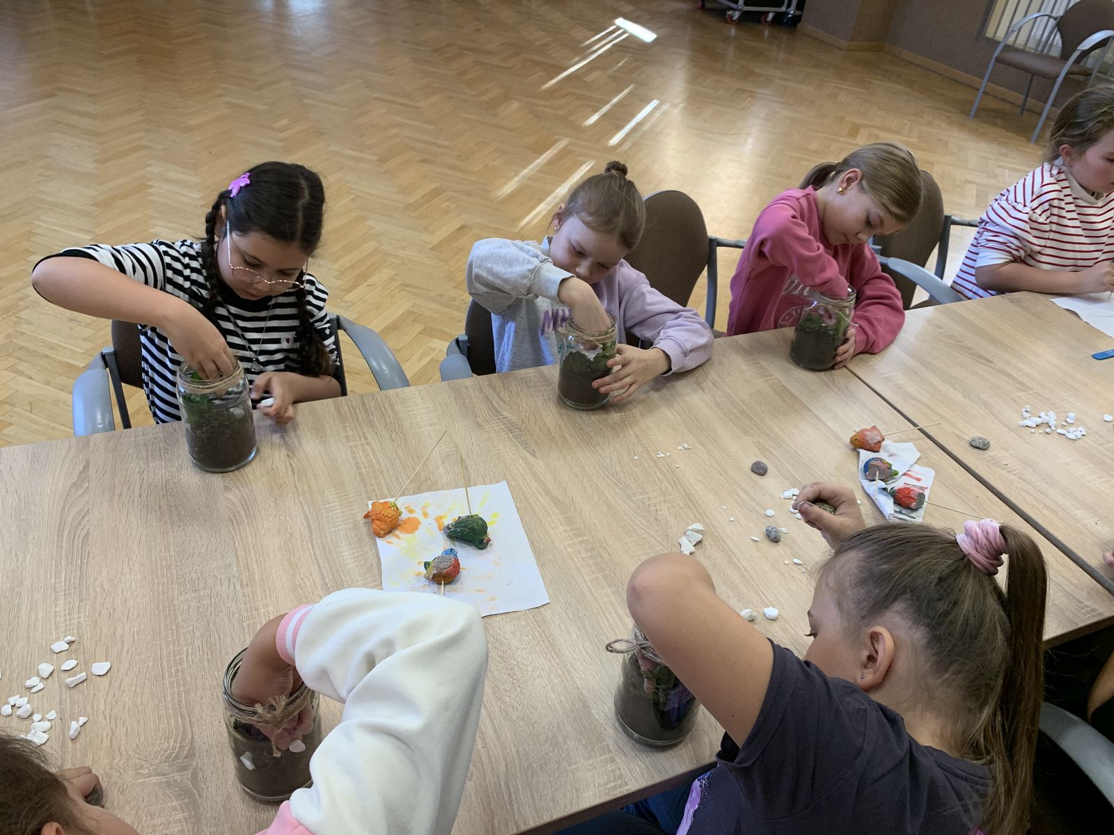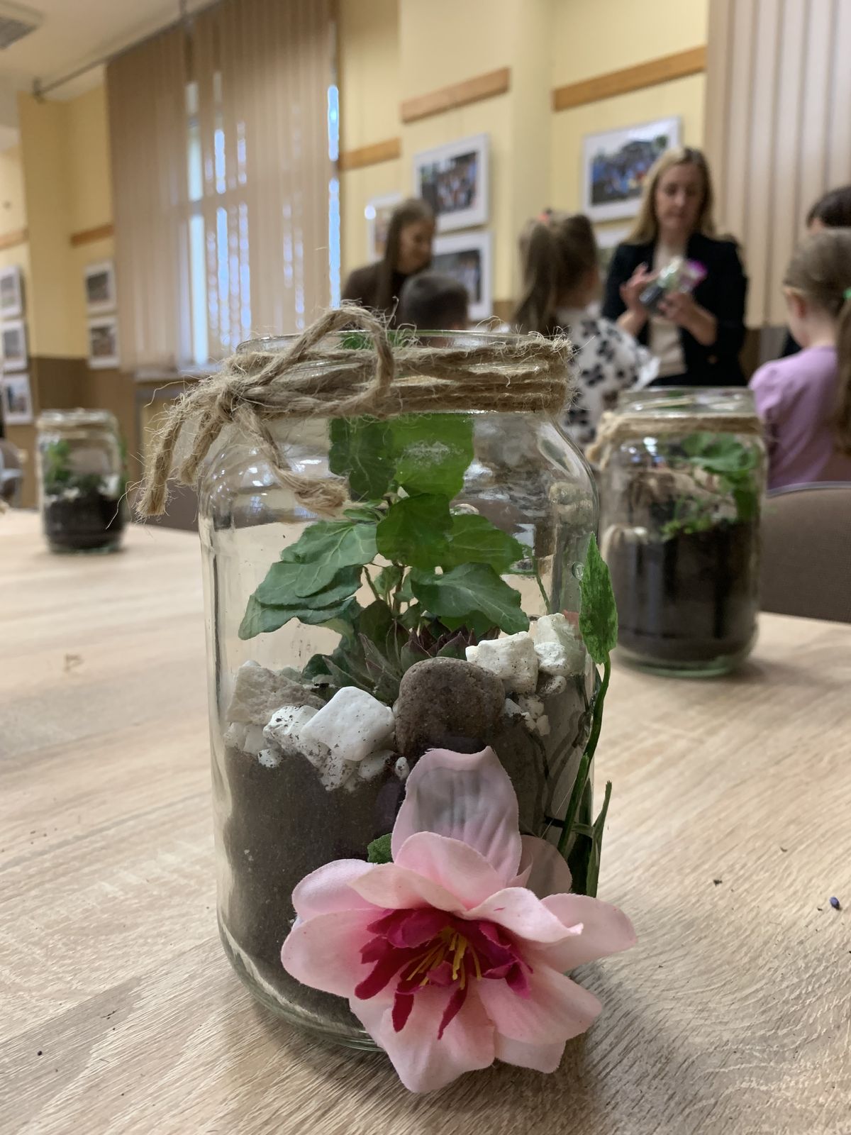 W części praktycznej eko-warsztatów uczestnicy stworzyli własne mini-ekosystemy w słoikach, składające się z podłoża, roślin, kamyczków, kolorowych ptaszków i ozdobnych kwiatów. Dzieci zabrały własnoręcznie wykonane kompozycje do swoich domów, by o nie dbać i obserwować rozwój roślin.