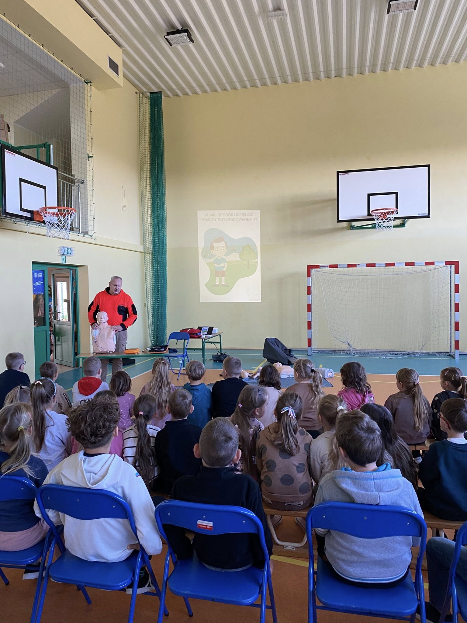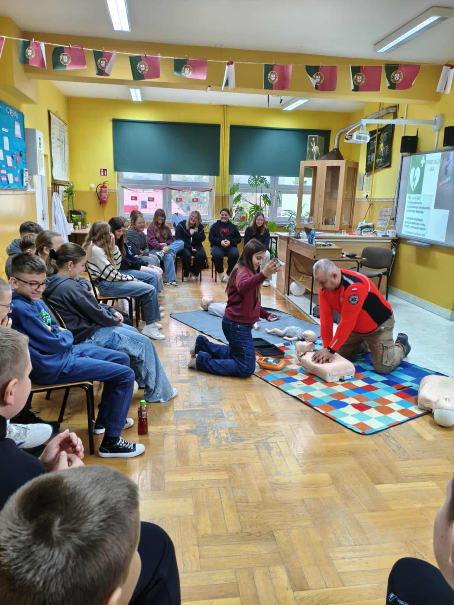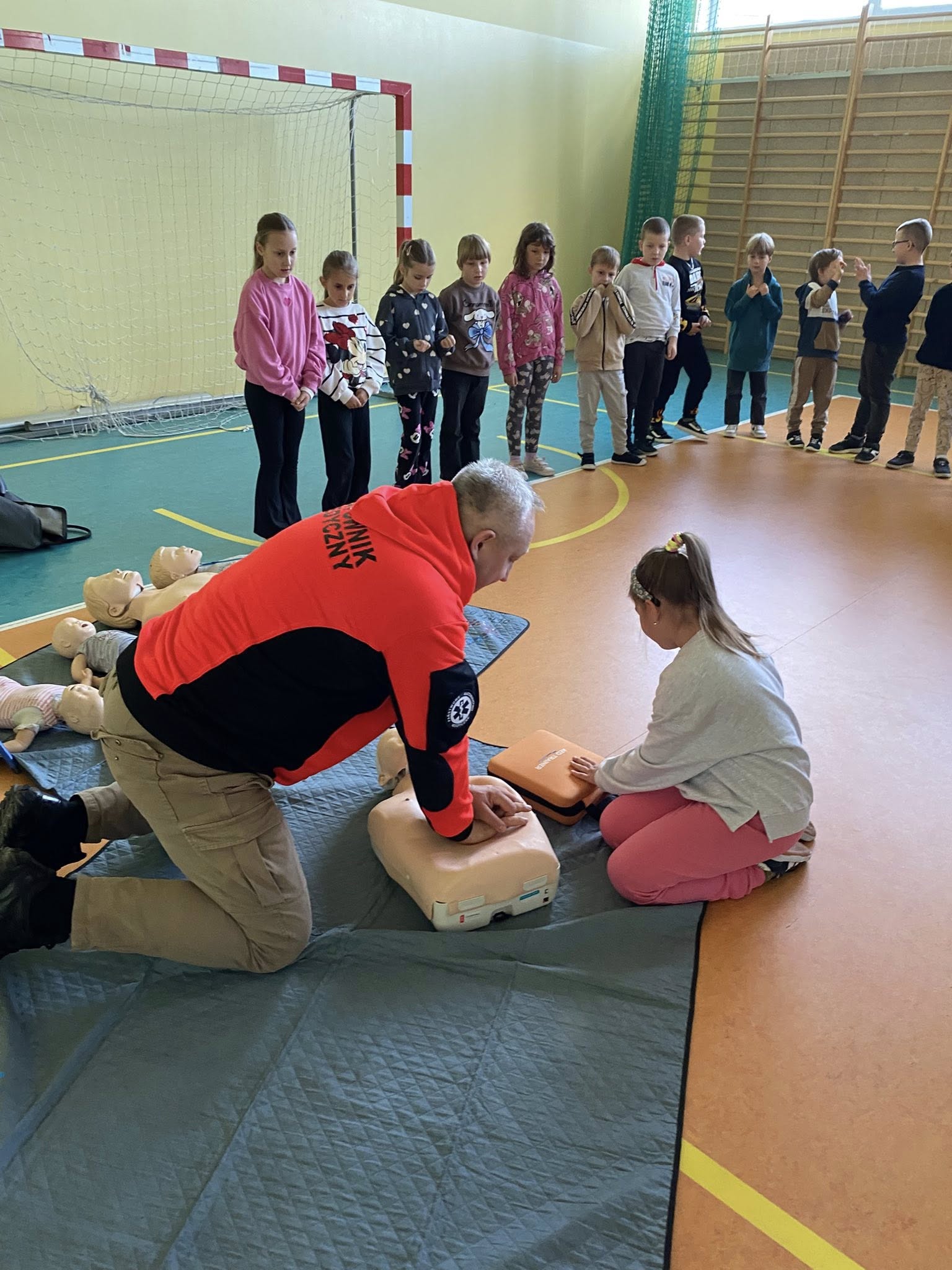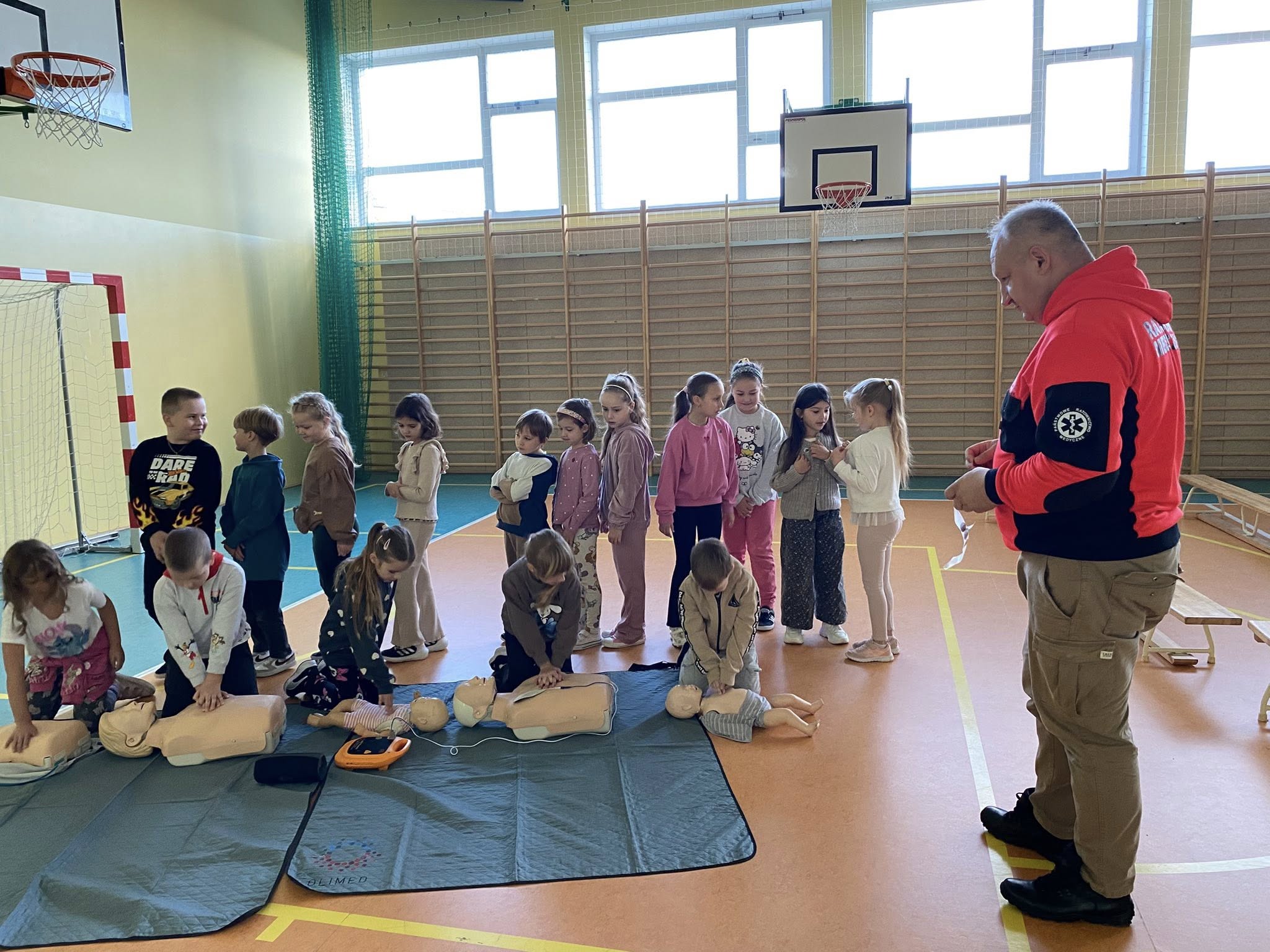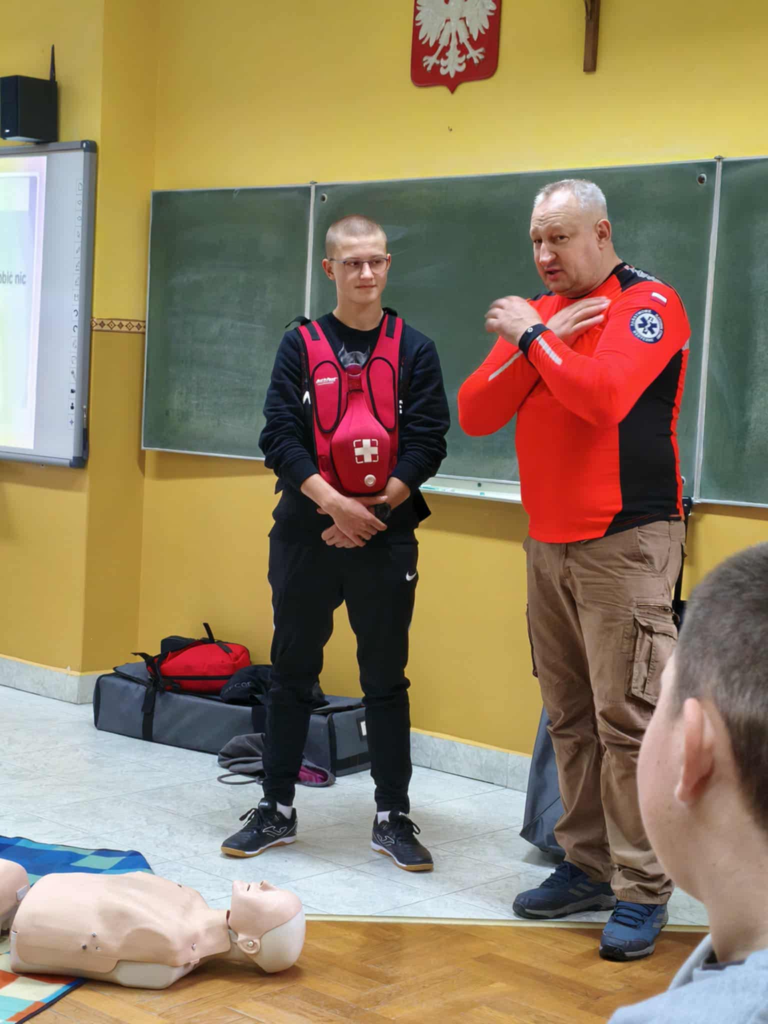 Podczas szkoleń ratownik medyczny przedstawił uczestnikom zasady oceny stanu osoby poszkodowanej, układania jej w pozycji bocznej oraz bezpiecznego obracania poszkodowanego. Uczestnicy dowiedzieli się, w jaki sposób należy przeprowadzać resuscytację krążeniowo ? oddechową, tamować krwotoki, wykonywać opatrunki, unieruchamiać kończyny oraz postępować przy zakrztuszeniu i urazie kręgosłupa. Uczniowie mieli okazję zastosować zdobytą wiedzę w praktyce, asystując ratownikowi medycznemu, wykonując uciski klatki piersiowej na fantomach oraz przygotowując opatrunki.