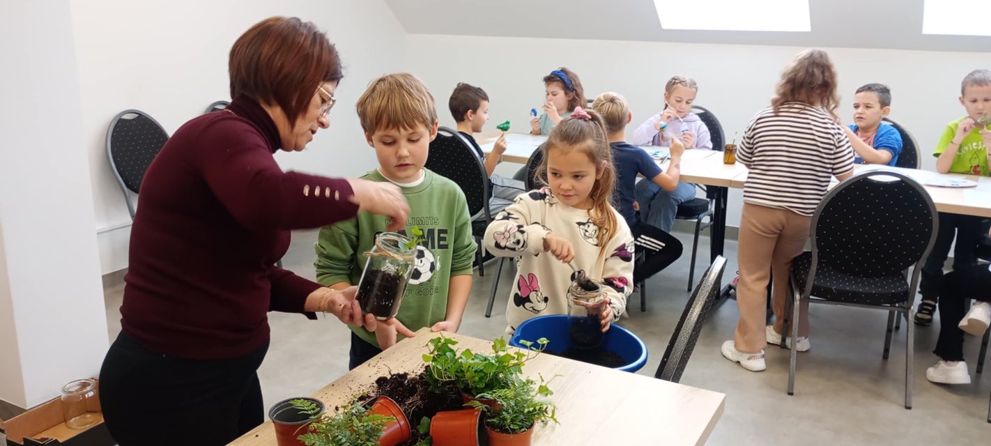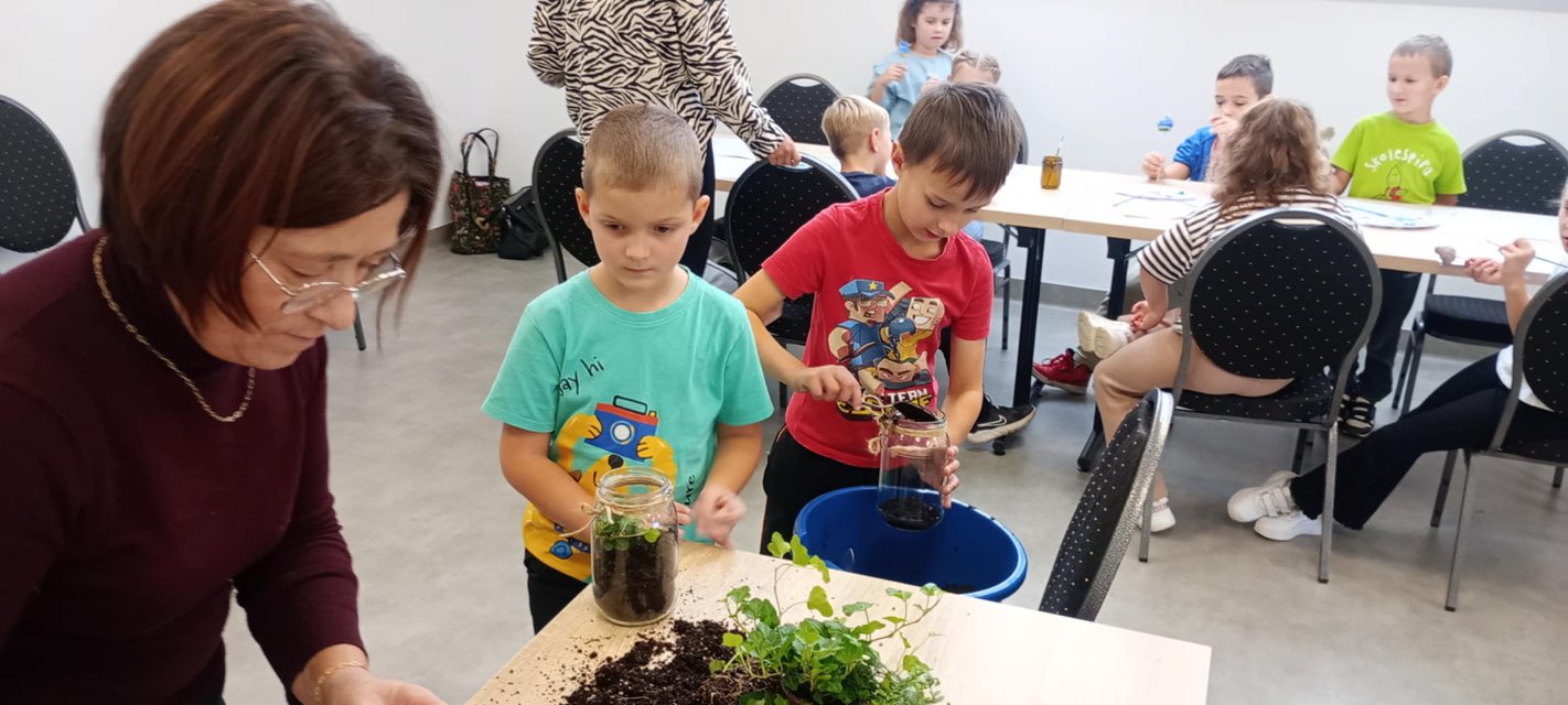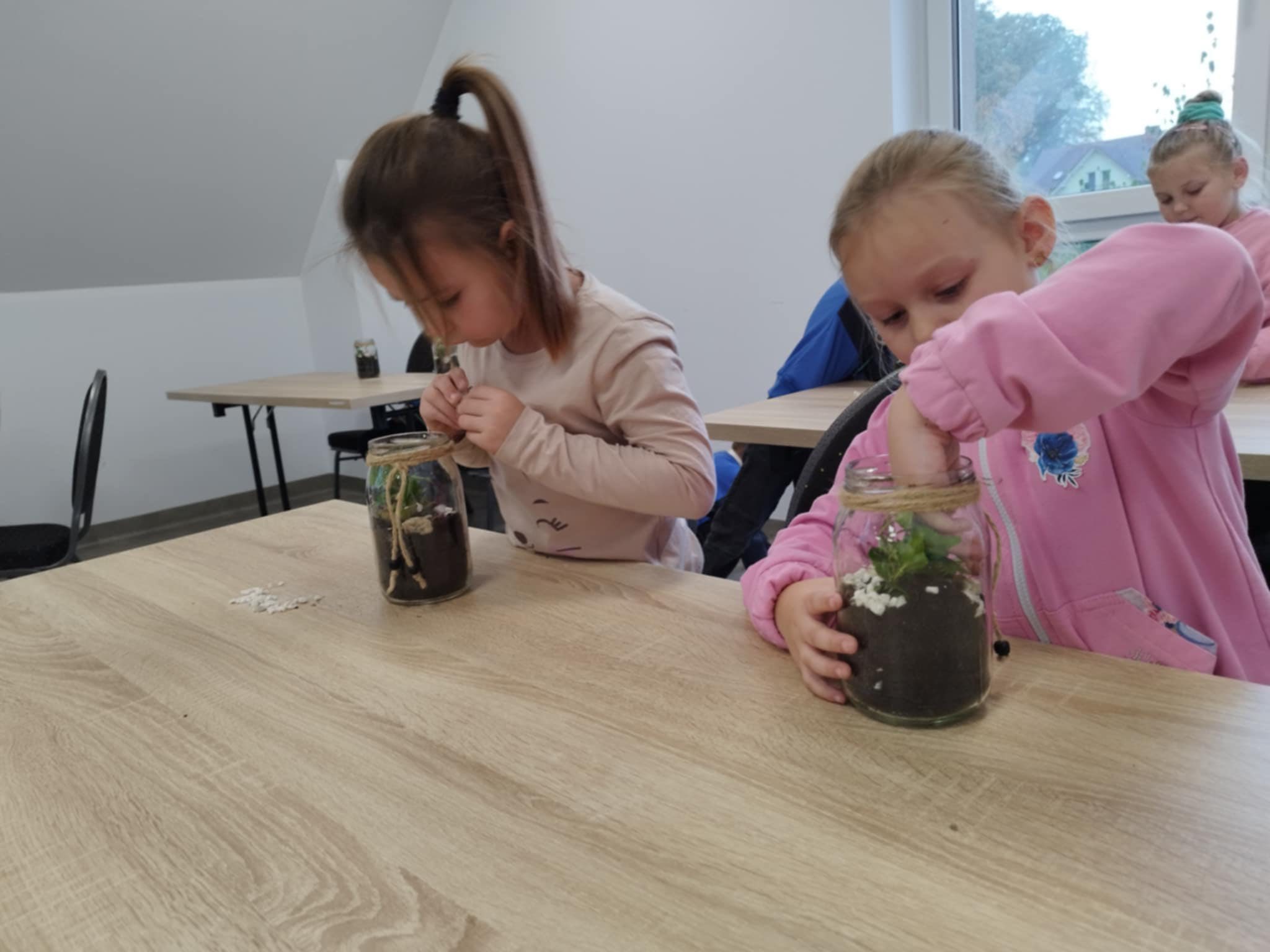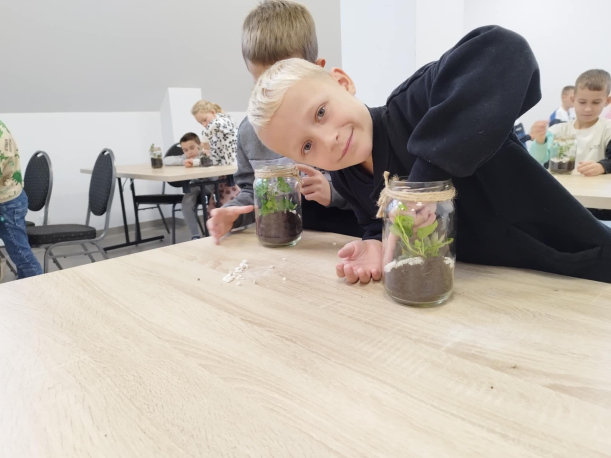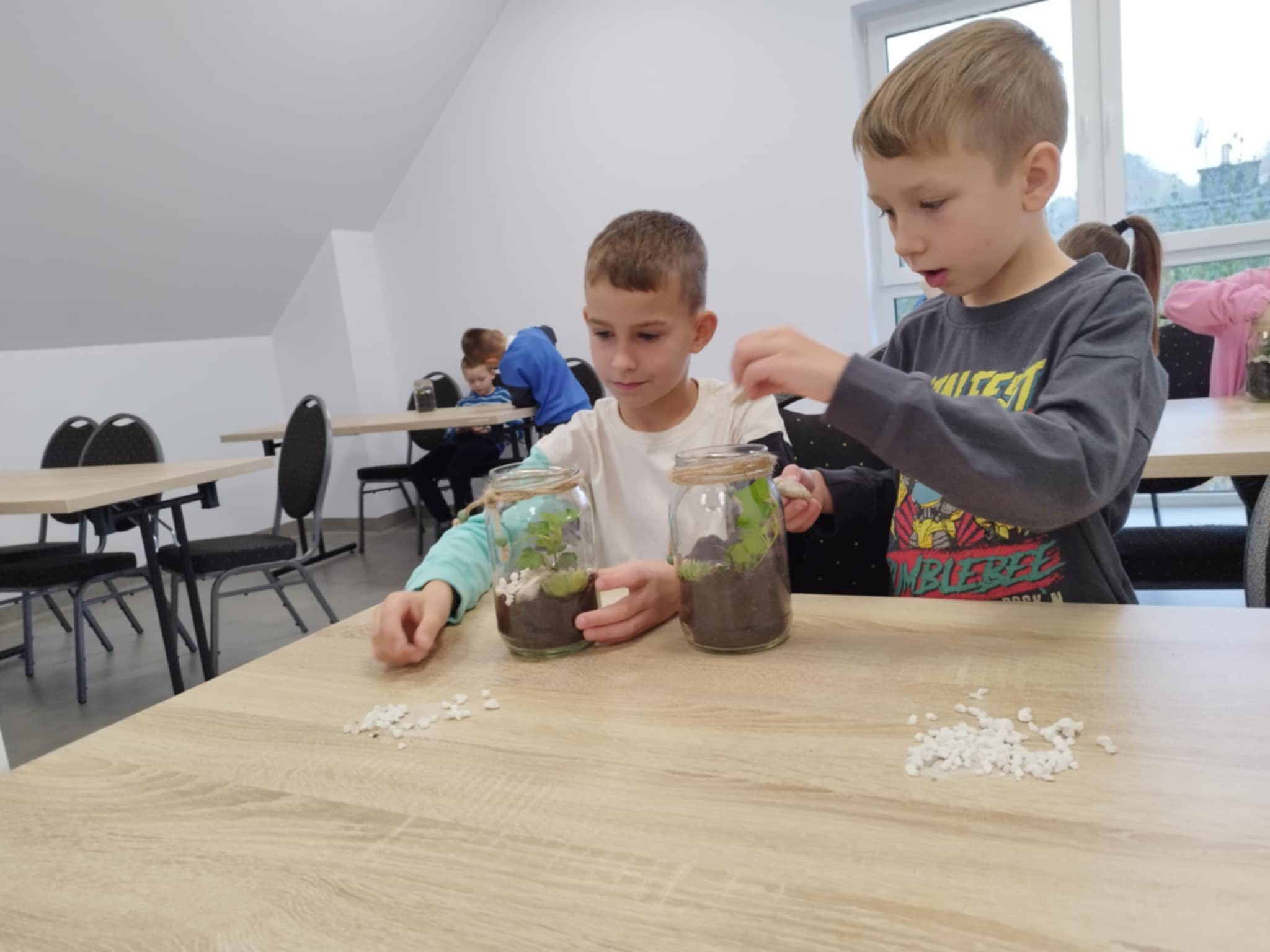 W części praktycznej eko-warsztatów uczestnicy stworzyli własne mini-ekosystemy w słoikach, składające się z podłoża, roślin, kamyczków i ozdób. Dzieci zabrały własnoręcznie wykonane kompozycje do swoich domów, by o nie dbać i obserwować rozwój roślin.
